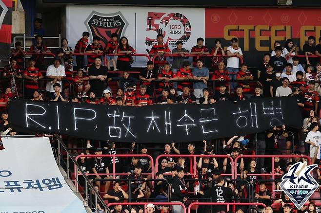 포항 팬들은 경기 시작 전 채 상병을 추모하는 현수막을 걸었고 3분간 응원을 펼치지 않았다.