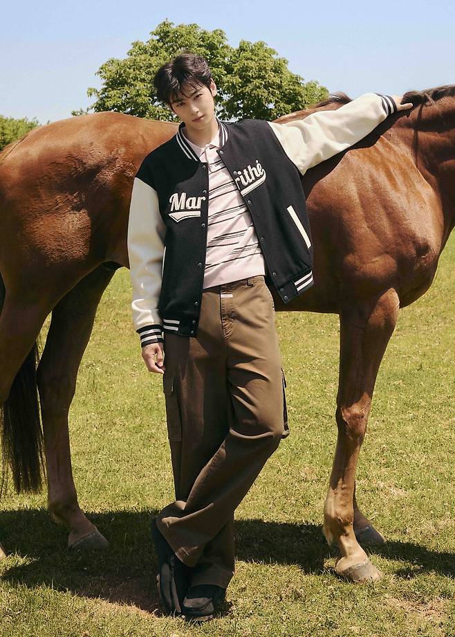 차은우는 클래식 로고 데님 블루종에 스웨트 팬츠를 매치하거나, 핑크 스트라이프 폴로 니트에 카고 팬츠와 바시티 재킷을 레이어드하는 등 세련된 믹스매치 스타일을 선보였다. 자연스럽게 흐트러진 헤어스타일과 깊이 있는 눈빛은 차은우만의 독보적인 아우라를 더욱 돋보이게 했다. 특히 승마장을 배경으로 한 화보에서 고윤정과 차은우는 완벽한 비주얼 케미를 자랑하며 보는 이들의 시선을 사로잡았다.