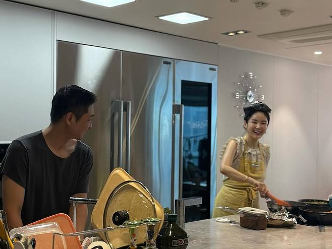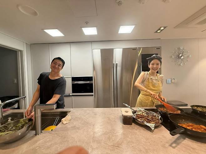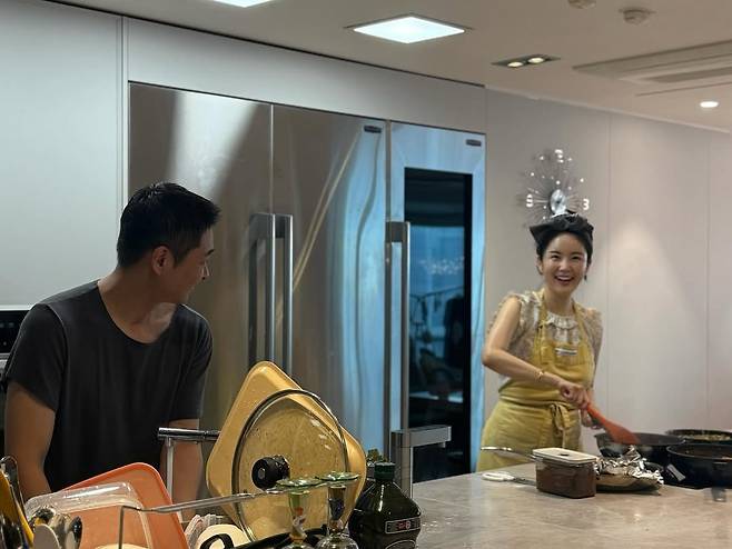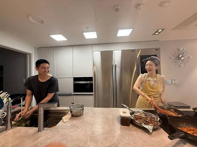 공개된 사진 속 두 사람은 마치 신혼부부처럼 나란히 선 채, 요리와 설거지로 역할을 나누며 환하게 웃는 모습이다.