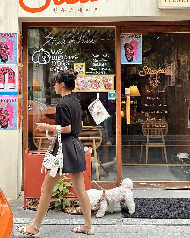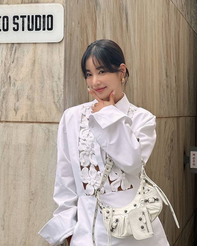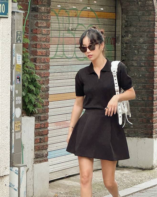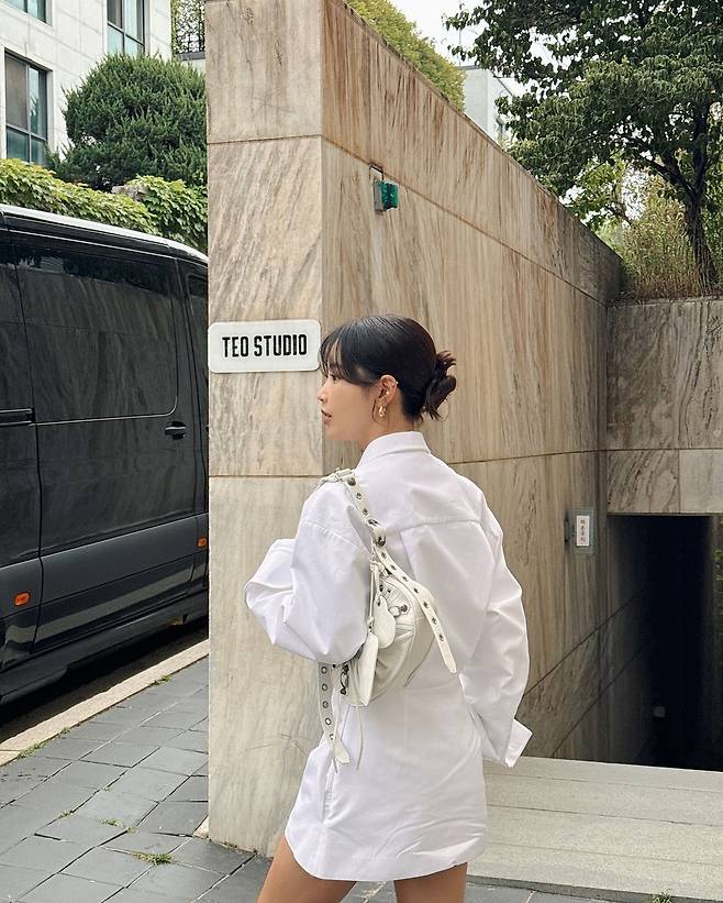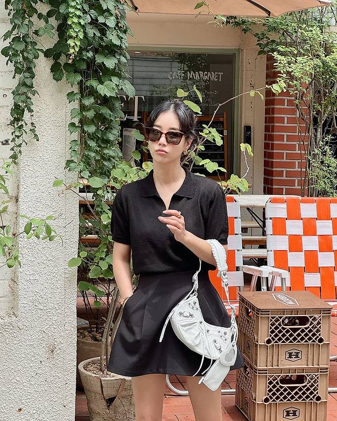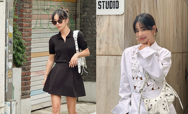 사진 속 기은세세는 블랙 카라티와 플레어 스커트를 입고 선글라스를 써서 시크한 모습을 선보였으며, 또 다른 사진에서는 흰 오버핏 셔츠와 미니스커트를 신고 흰 백을 들어 올화이트룩을 선보였다.