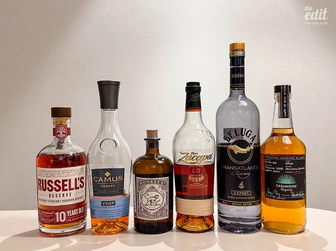 왼쪽부터 위스키, 브랜디, 진, 럼, 보드카, 데킬라
