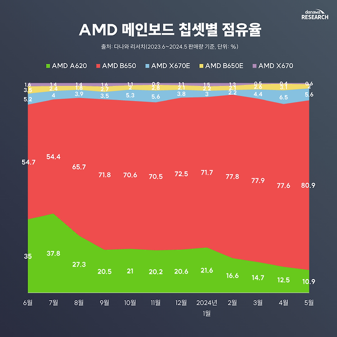 덕분에 지금은 B650 천하라고 해도 과언이 아니다. 보급형인 A620 메인보드의 수요까지 흡수하면서 2024년 5월 기준, AMD 메인보드 칩셋 중에서 80.9%의 점유율을 기록했다.