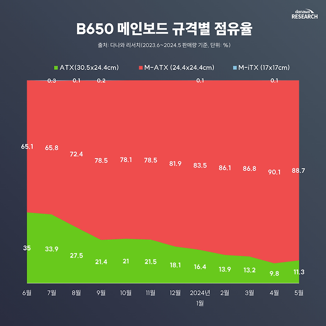 한편, B650 메인보드 출시 초반에는 M-ATX 규격이 약 60~70%, 풀사이즈 ATX 규격이 30~40% 사이의 비율이었지만 현재 시중에 판매되는 B650은 대부분 M-ATX 규격이다. 지난 5월, 다나와 리서치 기준으로 전체 B650 메인보드 판매량 중에서 88.7%가 M-ATX 규격이었다. 풀사이즈 ATX 규격은 11.3%에 불과하다. 소비자 시장의 수요에 부합하기 위해서 불필요한 가격 거품을 만드는 스펙을 과감하게 생략하고, 꼭 필요한 것들만 담아낸 M-ATX 규격이 우수한 가성비로 인기를 얻은 것으로 보인다.