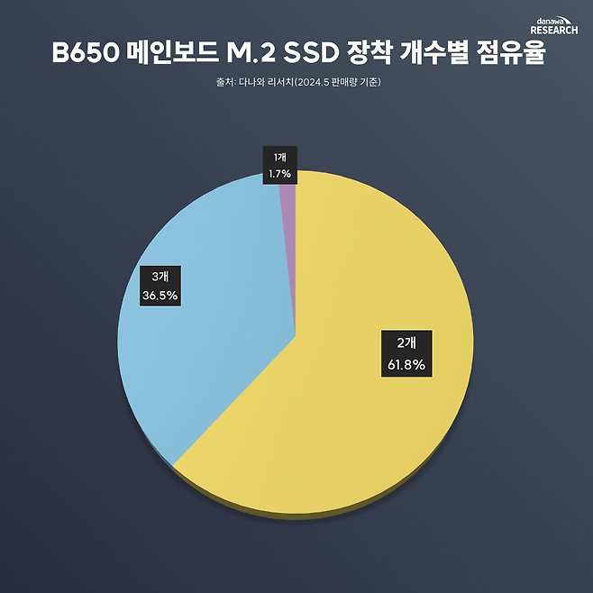 B650 메인보드 판매의 대부분이 작은 M-ATX 사이즈이지만, 그럼에도 불구하고 판매된 제품 중의 M.2 SSD는 대부분 2~3개를 장착할 수 있다. M.2 SSD 2개 장착 메인보드는 전체의 61.8%, 3개 장착 가능한 메인보드는 36.5%으로, 3개 장착이 지원되는 메인보드는 점점 더 늘어나는 추세다.