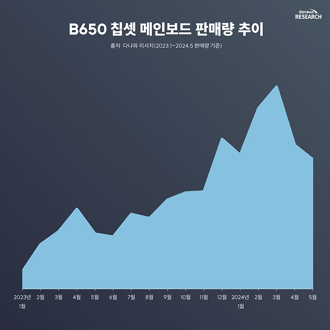다나와 리서치 기준, AMD B650 판매량은 출시 초반인 지난해 1월과 비교하면 1년 만에 약 8~10배가량 올랐다. 출시 초반에는 다나와에서 B650 메인보드를 아무도 구매하지 않는 날이 있을 정도로 파리가 날렸지만, 지금은 그때와 비교할 수 없을 정도로 잘 팔린다.