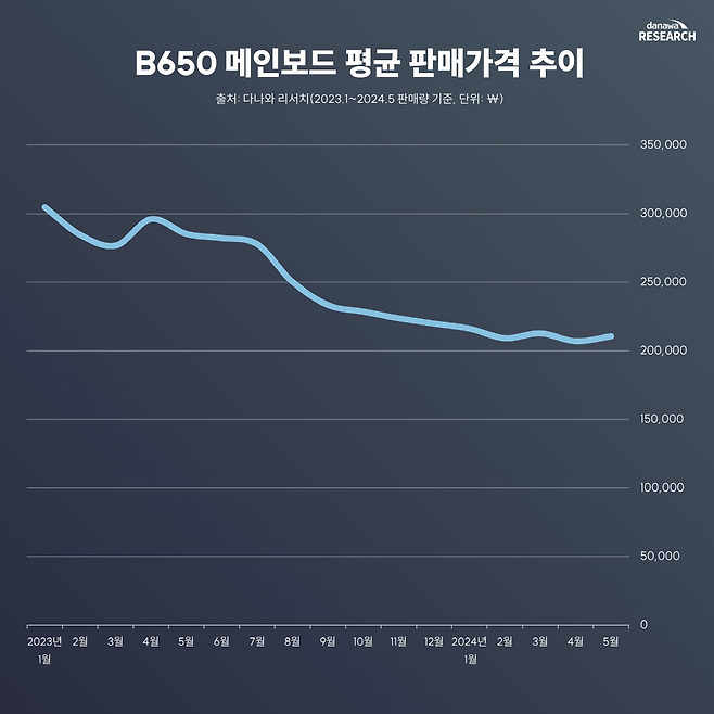 B650 메인보드 판매량 증가의 1등 공신은 역시 가격이다. B650 칩셋 메인보드의 평균 단가 변동 추이를 살펴보면 지난해 1분기에는 평균 28~30만 원에 육박했지만, 지난해 3분기부터 가격이 대폭 하락하며 20만 원대 초반까지 급락했다. 판매량 편화 추이 그래프와 함께 보면 이 시기부터 소비자들이 지갑을 열기 시작했음을 확인할 수 있다.