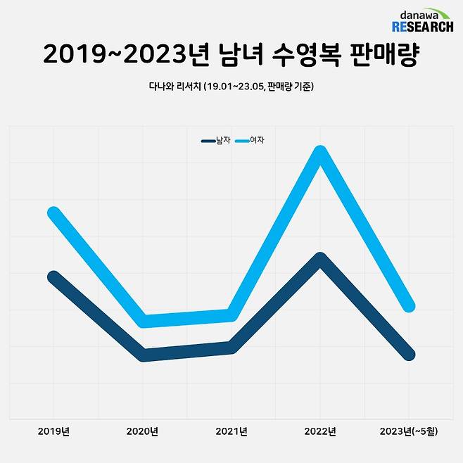 2022년 한 해 수영복 판매량은 2020년 대비 2.5배 이상 상승했으며, 특히 여성 수영복 판매량은 2020년에 비해 3배 이상 뛰어올랐다. 이는 2022년 사회적 거리두기가 완화되면서 그 동안 물놀이를 즐기지 못했던 아쉬움이 보상 심리로 이어진 것으로 보인다. 한편 2023년 6월까지 수영복 판매량은 전년 대비 42% 수준에 머무르고 있어, 2022년 만큼은 아니지만 코로나19가 터지기 이전의 수준을 회복할 것으로 보인다.