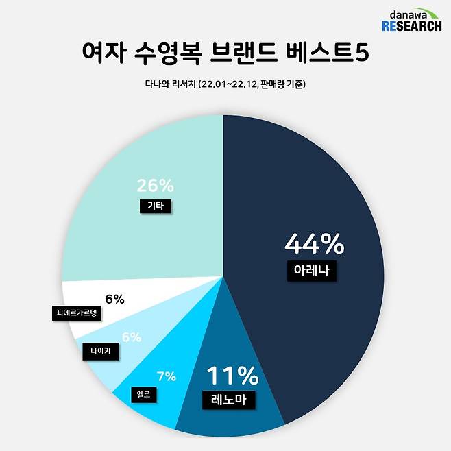 여자 수영복 브랜드 역시 아레나가 44% 점유율로 1위를 차지했다. 1973년 설립된 아레나는 50년간 수중 스포츠에 대한 열정과 혁신에 전념해왔으며 일반용, 선수용을 가리지 않고 다양한 디자인을 통해 최고의 퍼포먼스를 제공해 남녀노소를 불문하고 많은 사랑을 받고 있다. 2위는 11% 점유율을 가진 레노마가 차지했으며, 우아한 디자인을 선보이는 브랜드 엘르가 7% 점유율로 3위에 올랐다. 또한 세계적인 스포츠 브랜드 나이키와 이탈리아의 유명 패션 브랜드 피에르가르뎅이 각각 6% 점유율로 뒤따랐다.