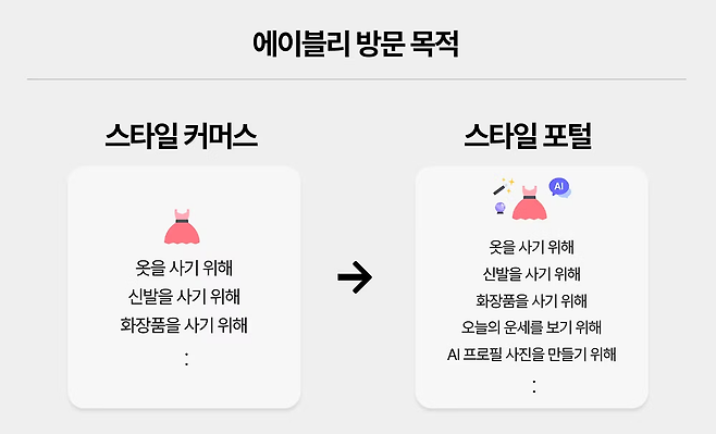 그리고 이 데이터는 에이블리가 지향하는 ‘초개인화 AI 쇼핑’에 활용할 수 있어요. 이제는 패션뿐 아니라 뷰티, 라이프까지 다루고 있는 에이블리에게 큰 도움이 될 거예요. 게다가 에이블리는 AI프로필, 운세, 웹툰·웹소설, 코디 등 쇼핑 외의 서비스들을 론칭하면서 스타일 포털이라는 목표를 굳히고 있기도 하죠.