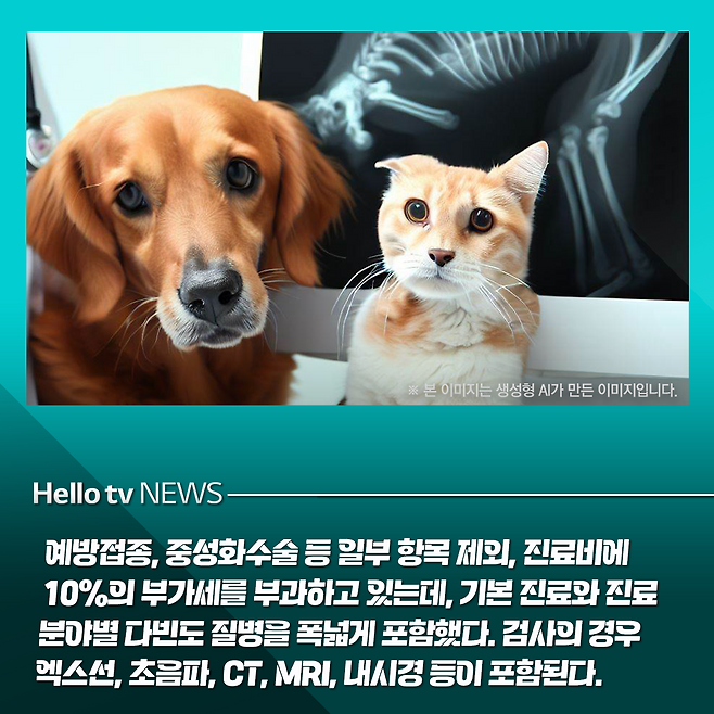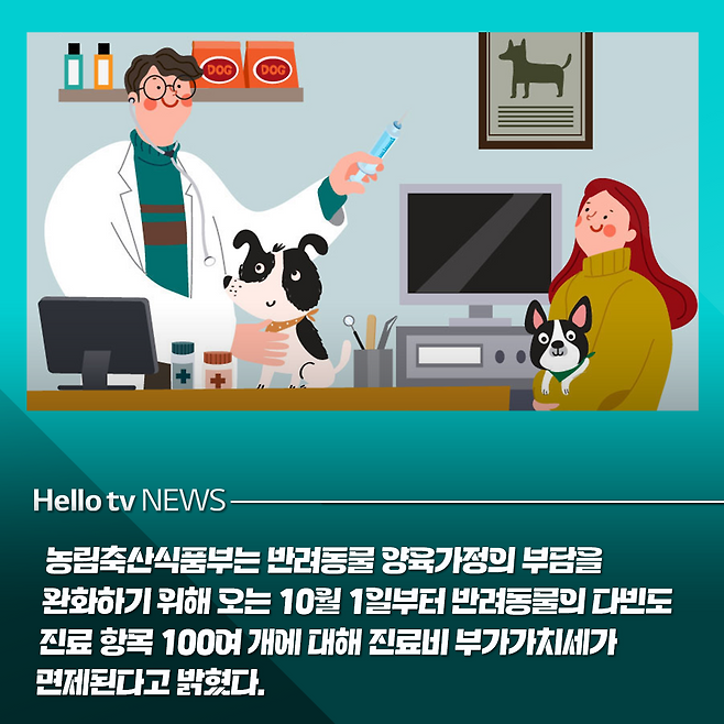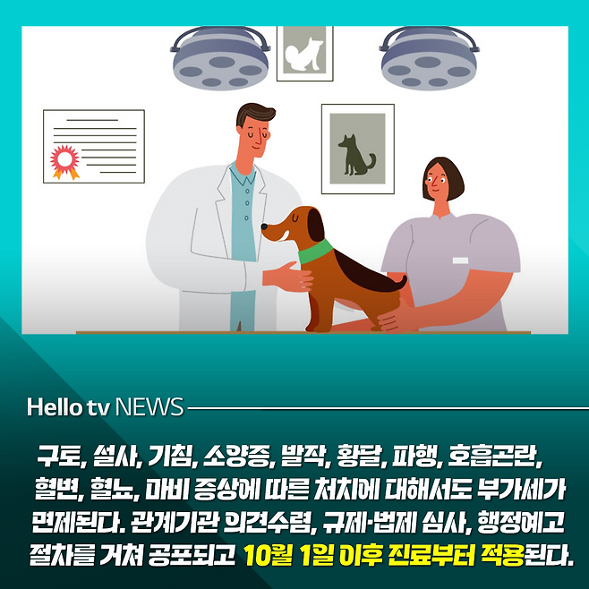 정부는 예방접종, 중성화수술 등 일부 항목을 제외하고 동물병원 진료비에 10%의 부가세를 부과하고 있는데, 10월부터는 부가세 면제 대상을 100여개 진료 항목으로 확대하기로 했다.