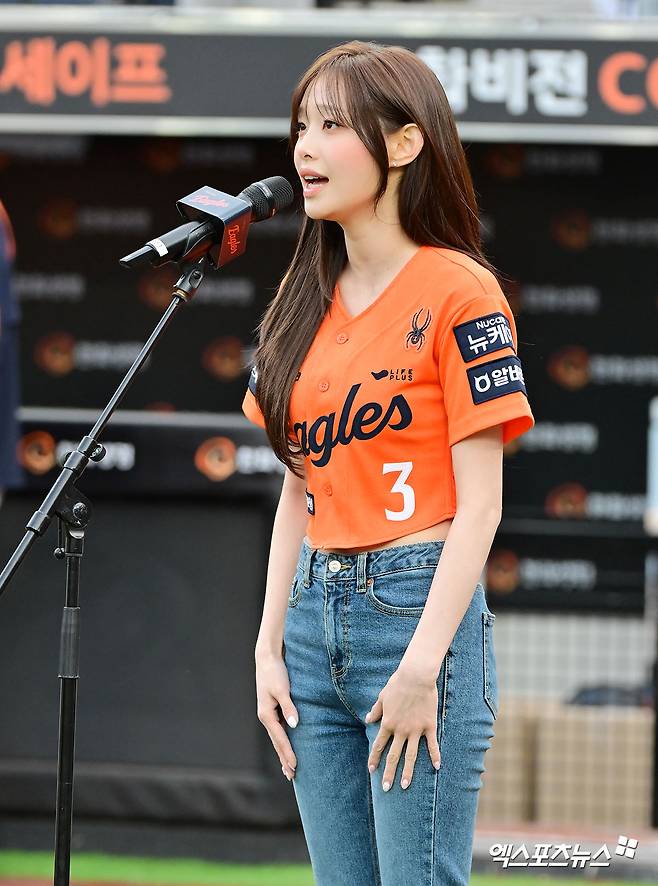 (엑스포츠뉴스 대전, 김한준 기자) 17일 오후 대전 한화생명 볼파크에서 열린 '2025 신한 SOL Bank KBO리그' SSG 랜더스와 한화 이글스의 더블헤더 2차전 경기, 경기 전 가수 츄가 애국가를 부르고 있다.