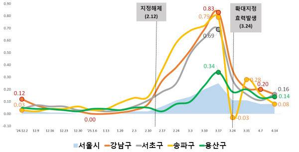 시에 따르면 강남구 아파트 가격 상승률은 지난 3월 셋째주 0.83%에서 4월 둘째주 0.16%로 0.67%포인트(p) 낮아졌다. 서초구는 0.69%에서 0.16%로, 송파구는 0.79%에서 0.08%로, 용산구는 0.34%에서 0.14%로 각각 하락했다.
