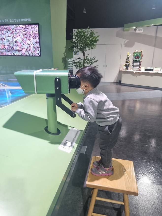 망원경으로 들여다보면 앞에 있는 지도 위로 움직이는 동물들이 나타난답니다. 아이가 신기한지 눈을 못 떼네요.
