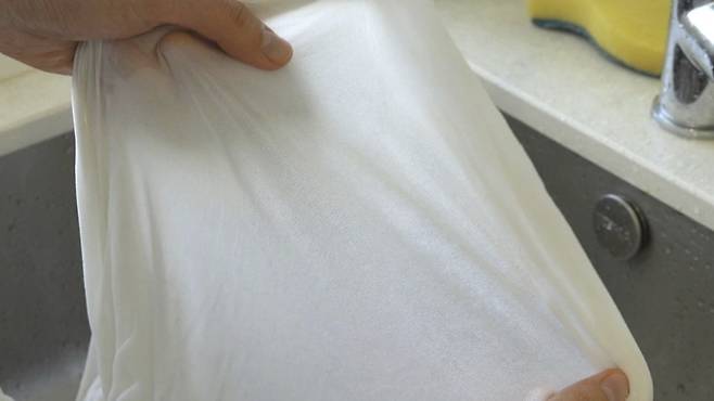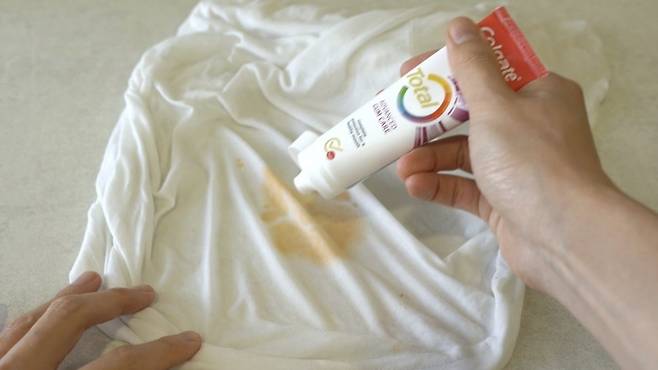 마지막으로 물로 헹궈 주면, 이렇게 감쪽같이 김치국물 자국이 제거된 것을 볼 수 있답니다. 쉽게 지울 수 없던 자국이 치약 한 방울로 아주 깔끔하게 제거 됐어요.