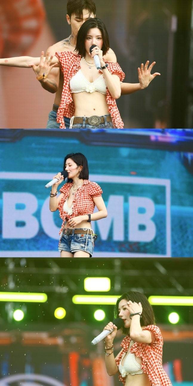 이날 무대의 주인공은 단연 권은비였습니다. 올 화이트 비키니에 크롭 셔츠, 그리고 데님 핫팬츠를 매치한 스타일은 등장과 동시에 모든 시선을 강탈했습니다. 물에 젖어 더욱 도드라지는 탄탄한 보디라인, 그리고 특유의 당당한 눈빛과 제스처는 ‘워터밤의 정석’ 그 자체였죠. 카리스마 넘치는 워킹으로 무대에 오르는 순간, 관객들의 함성은 엄청났습니다. “와 권은비 미쳤다!”라는 감탄사가 절로 터져 나왔으니까요.
