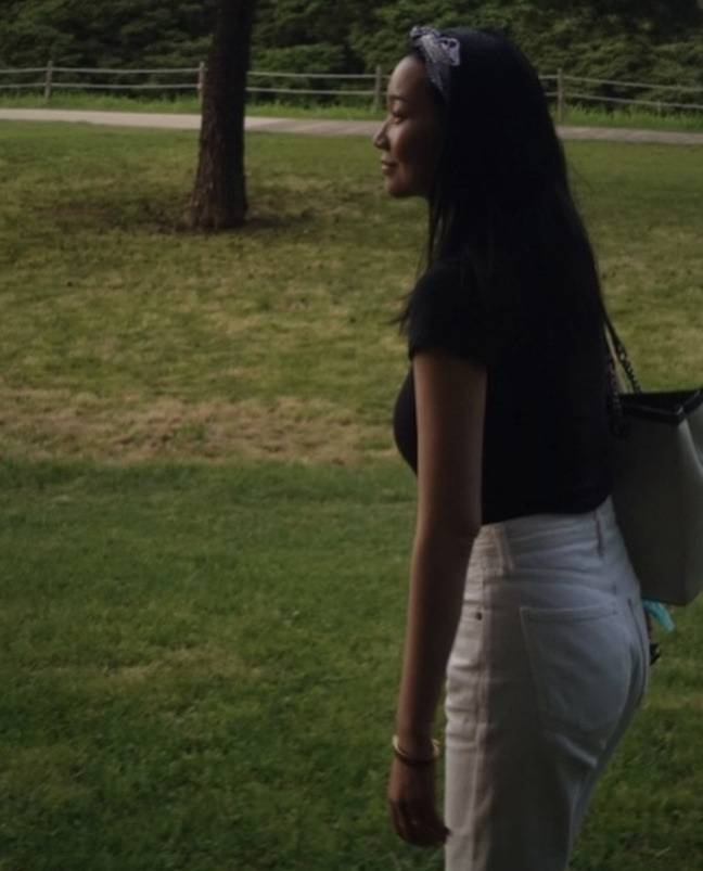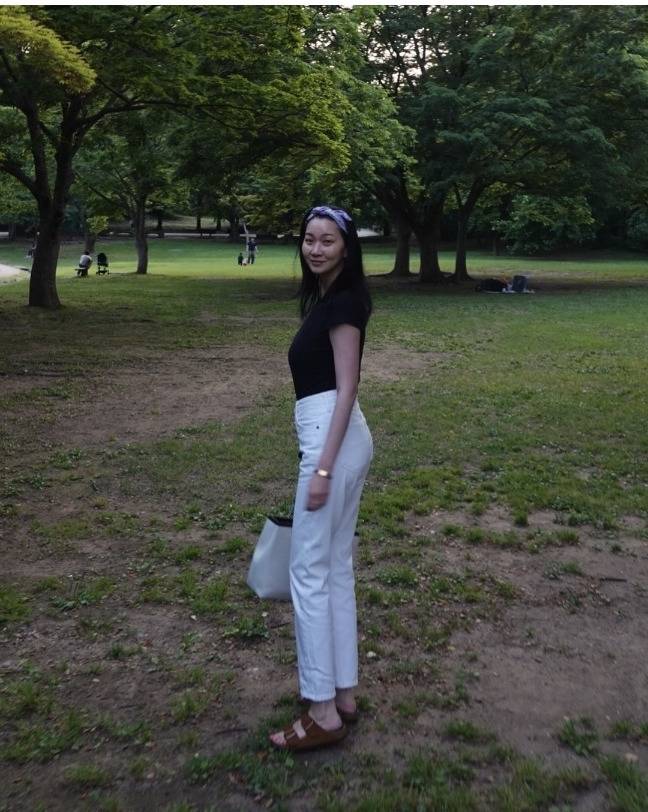 장윤주는 블랙 슬림 티셔츠와 화이트 진의 조합으로 군더더기 없는 실루엣을 완성했습니다.