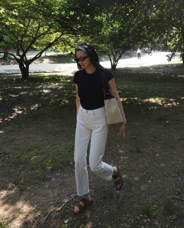 브라운 샌들과 아이보리 토트백은 전체 룩에 안정감을 더하며 실용성과 멋을 동시에 살렸습니다.