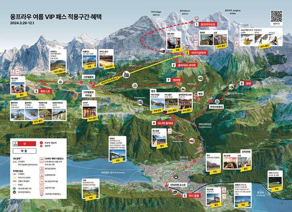 스위스 근교로 멀리가시는게 아니라 인터라켄 인근에서만 스위스 여행 예정이시라면 융프라우 VIP 패스을 추천드립니다. 융프라우 VIP 패스는 융프라우요흐 왕복 1회 포함, 인터라켄 근방 여러 산악열차 및 교통 등 무료가능해 알차게 인터라켄을 즐기고 오기 좋은 패스입니다.