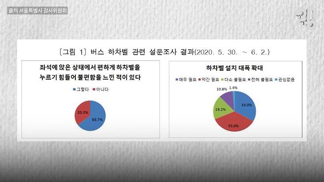 이건 2020년 서울시 감사위원회가 버스 탈 때 뭐가 가장 불편한지 설문조사를 한 건데 응답자 3391명 중 65%가 ‘하차벨을 누르기 힘들다고 했고, 69%는 ‘시내버스 하차벨을 추가로 설치해야 한다’고 답했다. 생각보다 많은 사람들이 좌석에 앉은 상태에서 버스 하차벨을 누르기 어렵고, 개수도 충분치 않아 스트레스를 받고 있다는 얘기다.