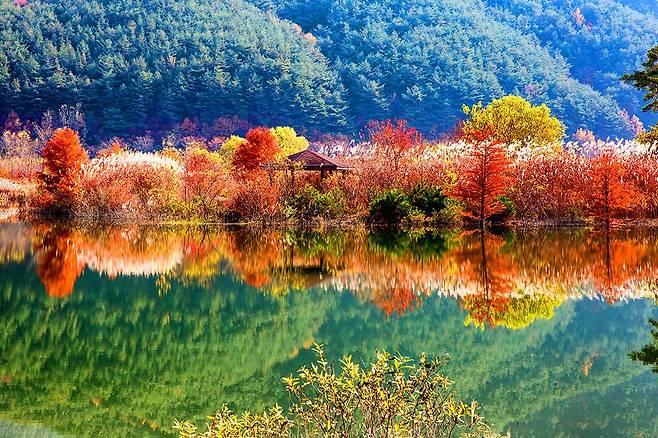 용담호는 신비로운 가을 풍경이 펼쳐지는 곳으로 주변을 알록달록하게 물들인 단풍이 호수에 비추어 몽환적인 분위기를 선사합니다.