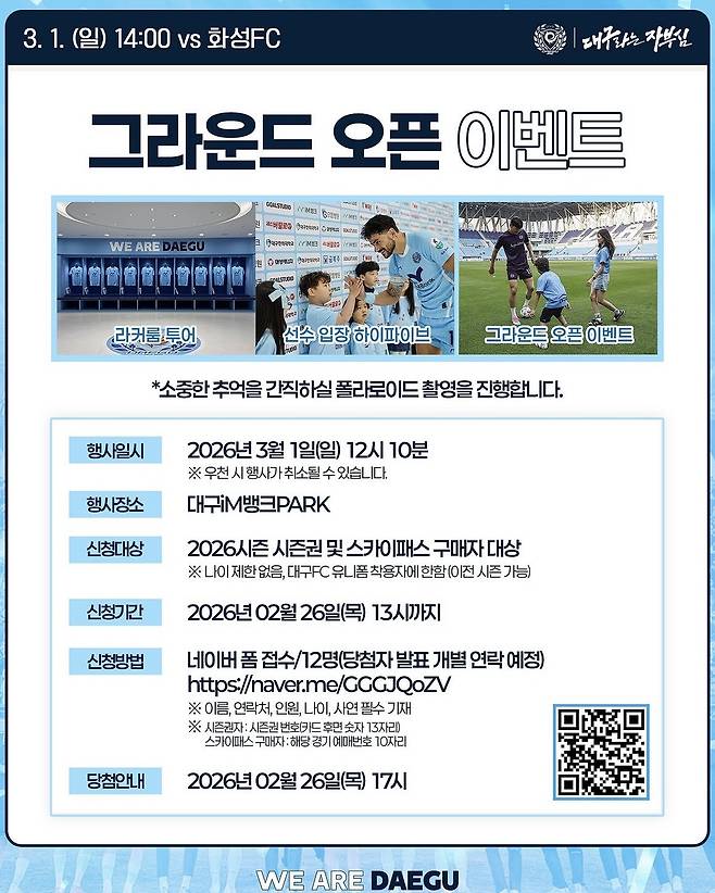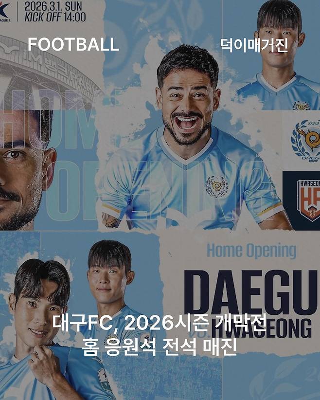 대구 구단은 "대팍을 가득 메워 주신 팬 여러분의 열정이 곧 우리 팀의 힘"이라며 "2026시즌 첫 홈경기를 팬들과 하나 된 열기로 하늘빛으로 물들이겠다"고 전했습니다.