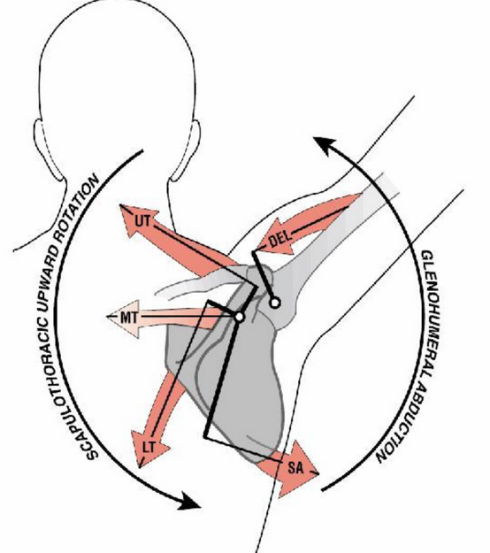 특히 팔을 올리면 회전근개(견갑골과 상완골을 연결하며 감싸 보호하는 안정화근육)중하나인 극상근(supraspinatus)과 삼각근은 적절한 타이밍을 유지해야합니다.