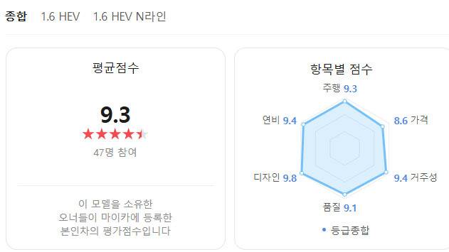실제 차주들의 평가를 기반으로 차량 만족도 점수를 공개하는 ‘네이버 마이카 오너평가’에 따르면 현대차 아반떼 하이브리드의 오너평가 점수는 9.3점이다. 가격을 제외한 모든 항목이 9점 이상을 기록했다.