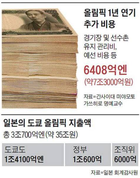 사상 최초로 올림픽이 미뤄지면서 일본 정부는 막대한 추가 비용을 지불하게 됐다. 아사히신문에 따르면 일본이 올림픽 준비를 위해 쓴 돈은 3조700억엔(약 28조7700억원)인데, 올림픽이 1년 연기되면서 경기장·선수촌 유지 관리비와 예선 비용 등으로 6408억엔(약 6조50억원)을 추가로 들였다고 전해진다.