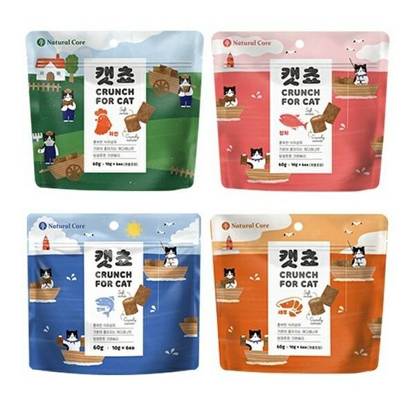 새우와 연어가 들어있는 고양이 건식 간식이에요. 이 외에도 맛이 다양하고, 양이 꽤 많아서 오래 급여하기에도 좋답니다.