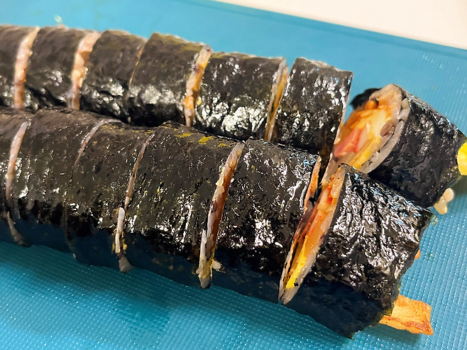 김밥 썰 때 칼은 무조건 잘 드는 것을 사용해야 김밥이 터지지 않습니다. 만일 일반 주방 칼이 잘 안 든다면 지그재그 모양이 나 있는 빵칼을 활용해 보세요.