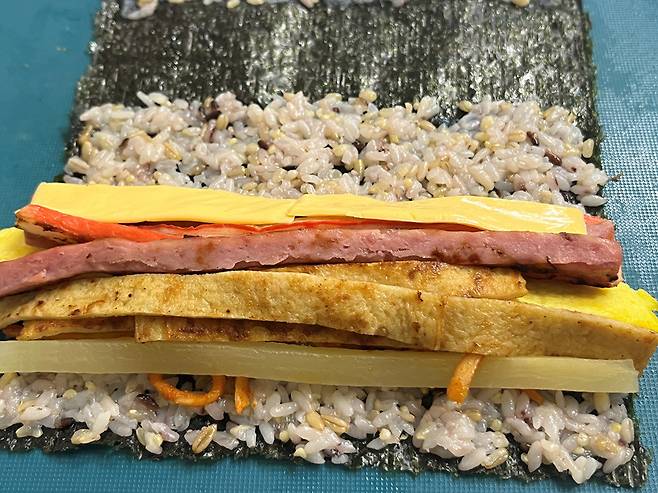 김밥 쌀 때 속재료는 최대한 겹치지 않게, 가지런히 놓습니다. 이렇게 해야 김밥을 말 때 훨씬 잘 말립니다.
