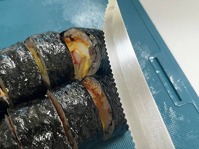 빵칼을 활용하면 칼날이 천천히 밀고 나가기 때문에 김밥 모양이 흐트러지지 않게 자를 수 있습니다.