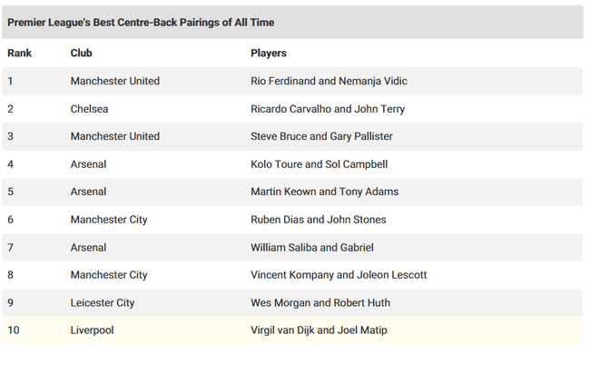 맨체스터 유나이티드의 전설적인 센터백 듀오 리오 퍼디난드와 네마냐 비디치가 프리미어리그 올타임 센터백 듀오 1위에 올랐다. 가브리엘 마갈량이스와 윌리엄 살리바도 TOP10에 이름을 올렸다.