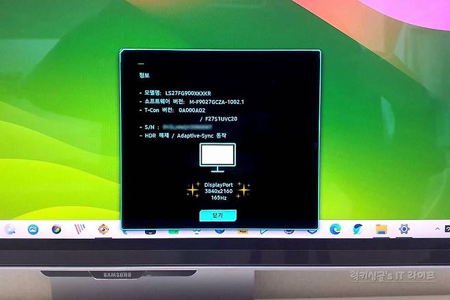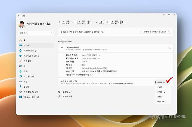 삼성 오디세이 3D S27FG900 게이밍 모니터는 최대 주사율 165Hz, 응답속도 1ms (GTG) 기본 스펙을 갖추었는데요. 윈도우11 디스플레이 설정에서 확인해 보니 '165Hz / 120Hz / 60Hz' 3가지 화면 주사율 선택을 지원하더라고요.