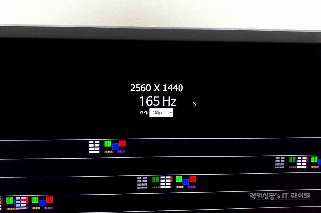 모니터 주사율 테스트를 통해서 1ms 빠른 응답속도와 165Hz 높은 주사율을 체감할 수 있었는데요. 60Hz 모니터에 익숙한 상태여서 그런지 빠르게 움직이는 이미지가 165Hz 주사율에서는 잔상과 끊김 없이 부드럽게 움직이는 모습이 무척 인상적이었어요. 다시 60Hz로 설정했을 때 상대적으로 뚝뚝 끊어지는듯한 모션 블러 현상과 눈의 피로도가 엄청난 역체감으로 바로 느껴지더라고요.