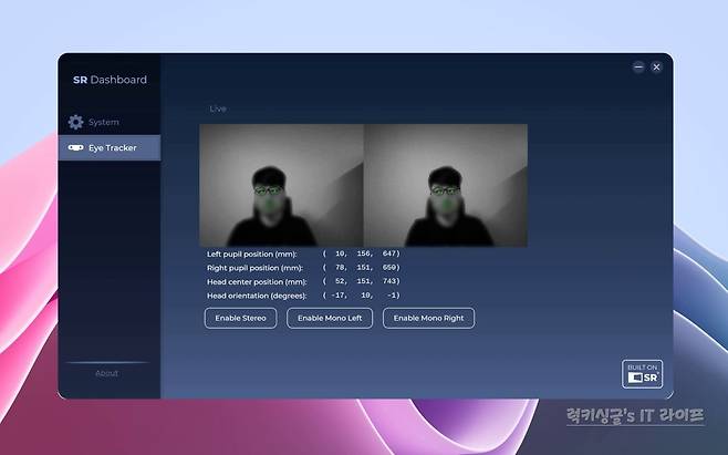 오디세이 3D 허브 프로그램에 포함된 SR Dashboard 프로그램을 실행하면 두 개의 카메라를 통해서 저의 얼굴과 좌우 눈의 위치가 실시간 추적되는 것을 알 수 있어요.