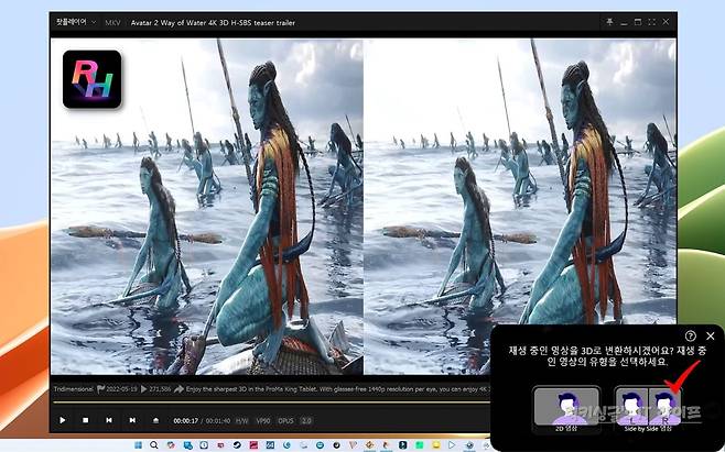 만약 좌우 두 개의 영상이 한 화면에 동시에 표시되는 3D 블루레이 타이틀을 팟플레이어로 재생한다면 3D 화면 전환 팝업 메시지에서 'Side by Side 영상'을 선택하면 되는데요. 2D 영상 또는 Side by Side 영상 두 가지를 모두 테스트해 보니 완벽하게 AI 3D 영상 변환이 가능하더라고요.