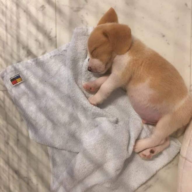 밀려오는 졸음을 참지 못한 아기 강아지는