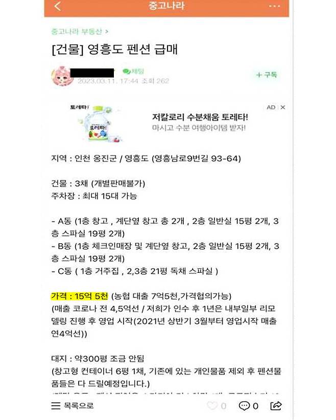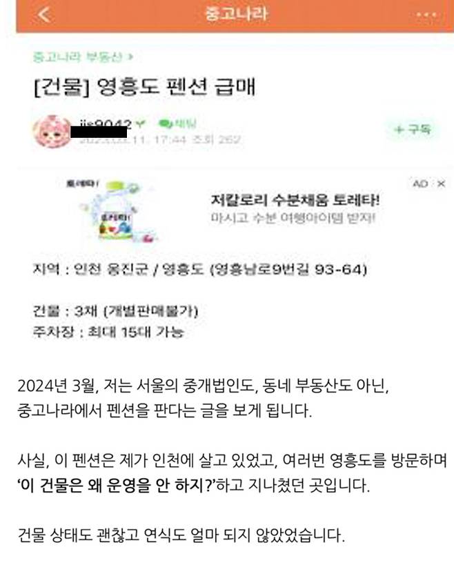 중고나라에서 11억 원짜리 펜션 샀네요..