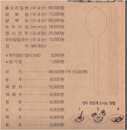 ▪️대표메뉴 가격: 통오리밀쌈 약 68,000원 / 닭볶음 약 75,000원