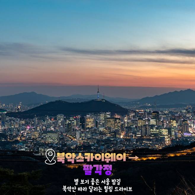 서울의 탁 트인 야경과 자연을 동시에 느낄 수 있는 서울 밤 드라이브 코스! 북악스카이웨이는 굽이진 산길을 따라 달리며 서울 도심과 북악산을 내려다볼 수 있는 것이 특징이에요.