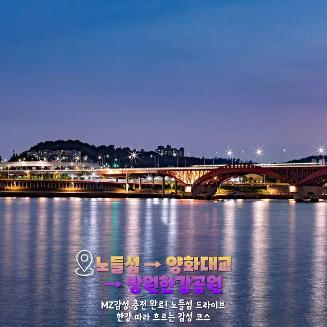 노들섬을 출발해 양화대교를 건너 망원한강공원으로 향하는 코스는 최근 MZ세대 사이에서도 인기 있는 서울 밤 드라이브 코스. 은은한 야경이 매력적인 노들섬은 감성적이고, 망원한강공원은 차에서 내려 잠시 쉬었다 갈 수 있어요.