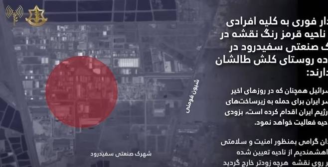 이날 공습이 가해지기 2시간 전인 새벽 1시 30분 이스라엘은 테헤란 북서쪽 235km 지점의 세피드루드 산업단지의 적색구역,