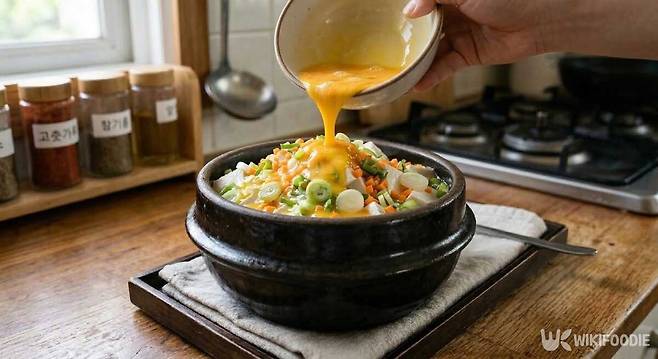 (4) 준비한 계란물을 두부와 채소 위에 골고루 부어준다.