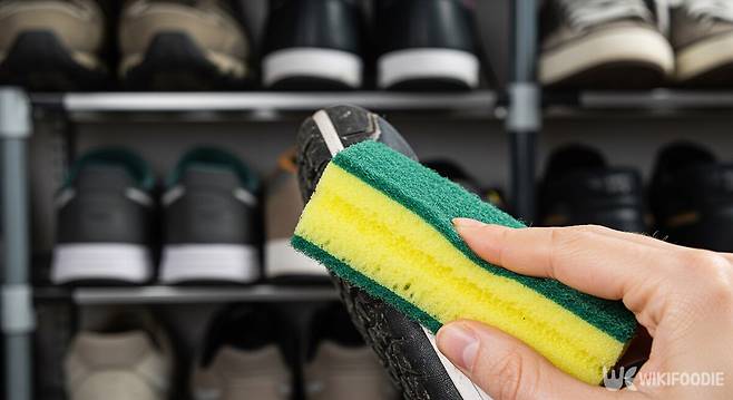 신발 바닥에는 먼지와 흙이 쌓여 관리가 필요하다. 사용한 수세미의 거친 면을 활용하면 오염을 쉽게 제거할 수 있다. 먼저 수세미를 적셔 신발 밑창을 문지르면 먼지가 떨어진다.