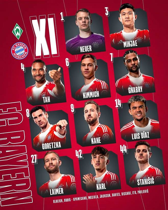 이날 뮌헨은 해리 케인과 루이스 디아스, 세르쥬 나브리, 레나르트 칼, 레온 고레츠카, 조슈아 키미히, 콘라드 라이머, 조나단 타, 김민재, 요시프 스타니시치, 골키퍼 마누엘 노이어가 선발했다.