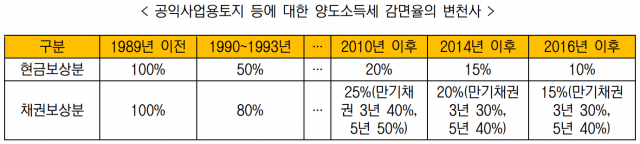 그러나 안타깝게도 ‘공익수용에 따른 양도소득세 감면’은 해를 거듭하면서 감면율이 감소되어서 현재는 현금보상분에 대해서는 10%의 감면, 채권보상에 대해서는 15%(만기채권 3년 30%, 5년 40%)의 감면율만을 적용하고 있다.