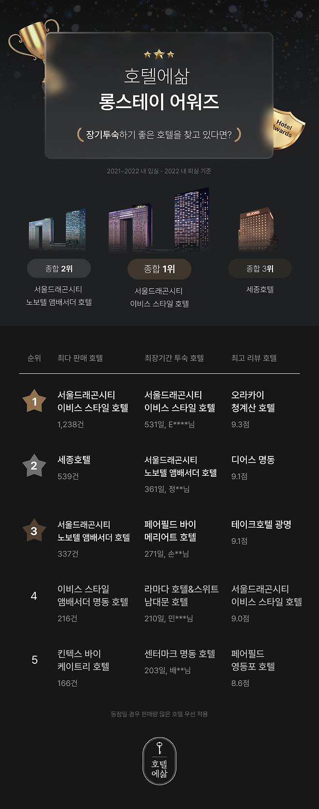 올해 종합 부문 대상은 '서울드래곤시티 이비스 스타일 앰배서더 호텔'이 수상했다. 총 구매 고객 수 1,238명, 최장 투숙 기간 531일(2021년 입실, 2022년 퇴실 고객 기준), 고객 리뷰 평점 9.0점(10점 만점 기준)을 기록하며 종합 최고 수상의 영예를 안았다.