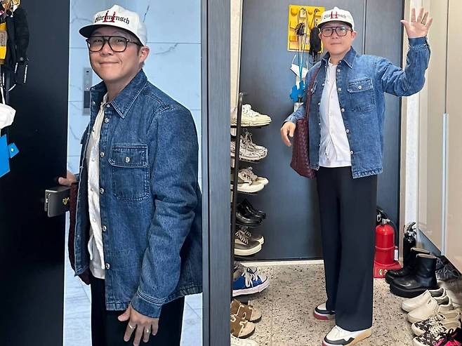 조세호는 진청 컬러의 데님 셔츠에 화이트 티셔츠를 레이어드하고, 넉넉한 핏의 블랙 팬츠를 매치해 편안한 분위기를 연출했습니다.