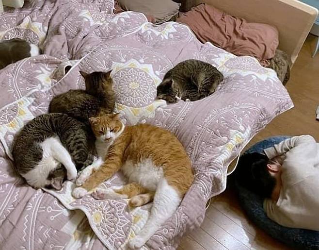 정작 침대 주인인 집사의 경우 고양이 5마리에게 침대를 내어주고 자신은 바닥에 누워서 잠든 신세로 지낸다는 것.